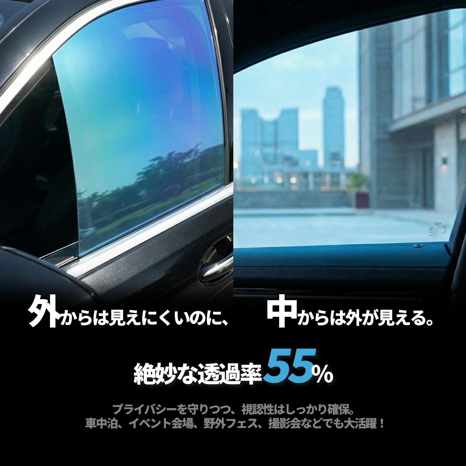 遮熱90%・UVカット99%で強烈な日差しをブロックし、車内温度の上昇や内装の日焼けを防止。外からは見えにくく、中からは見える透過率55%で、プライバシーと視認性を両立します。