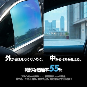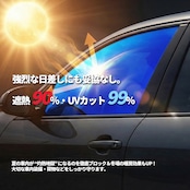 遮熱90%・UVカット99%で強烈な日差しをブロックし、車内温度の上昇や内装の日焼けを防止。外からは見えにくく、中からは見える透過率55%で、プライバシーと視認性を両立します。